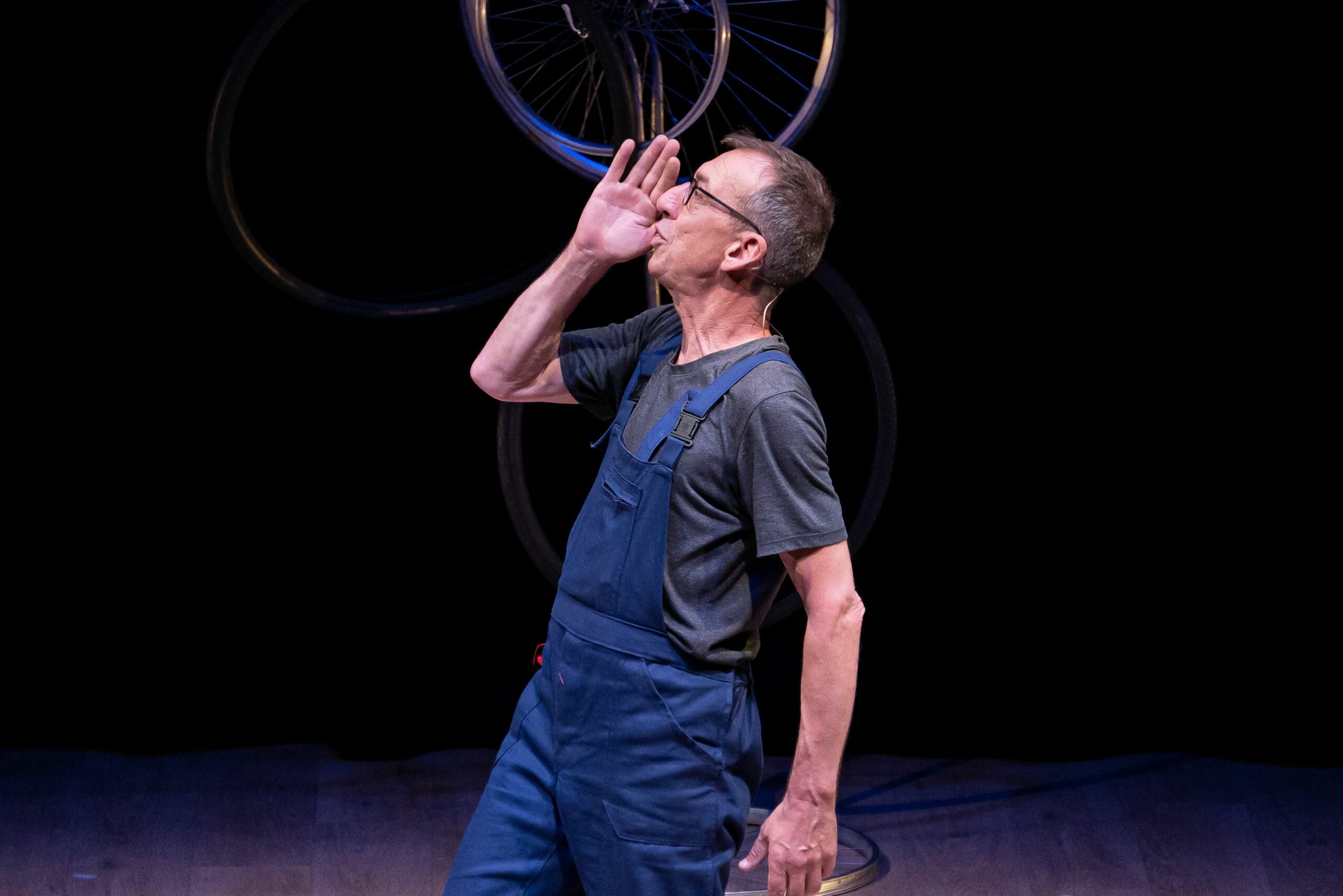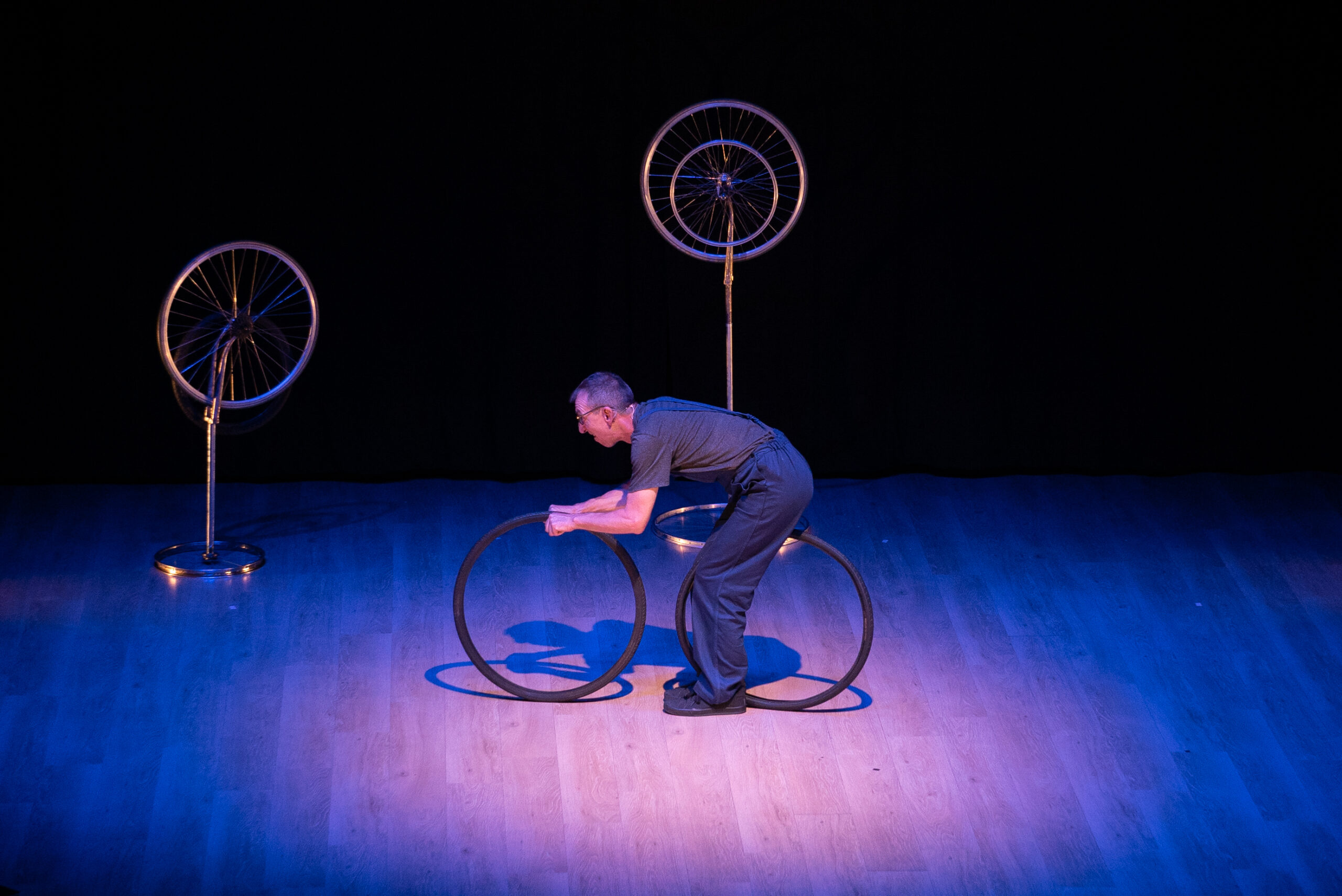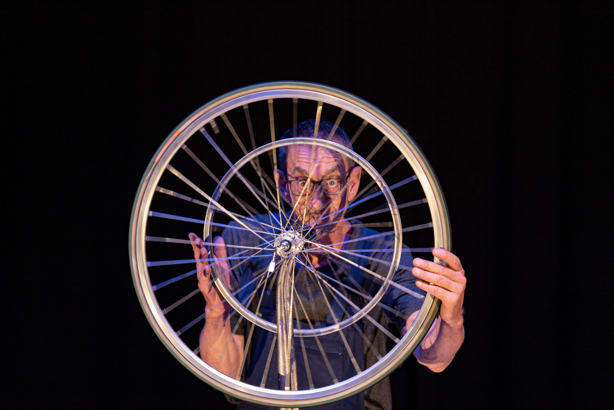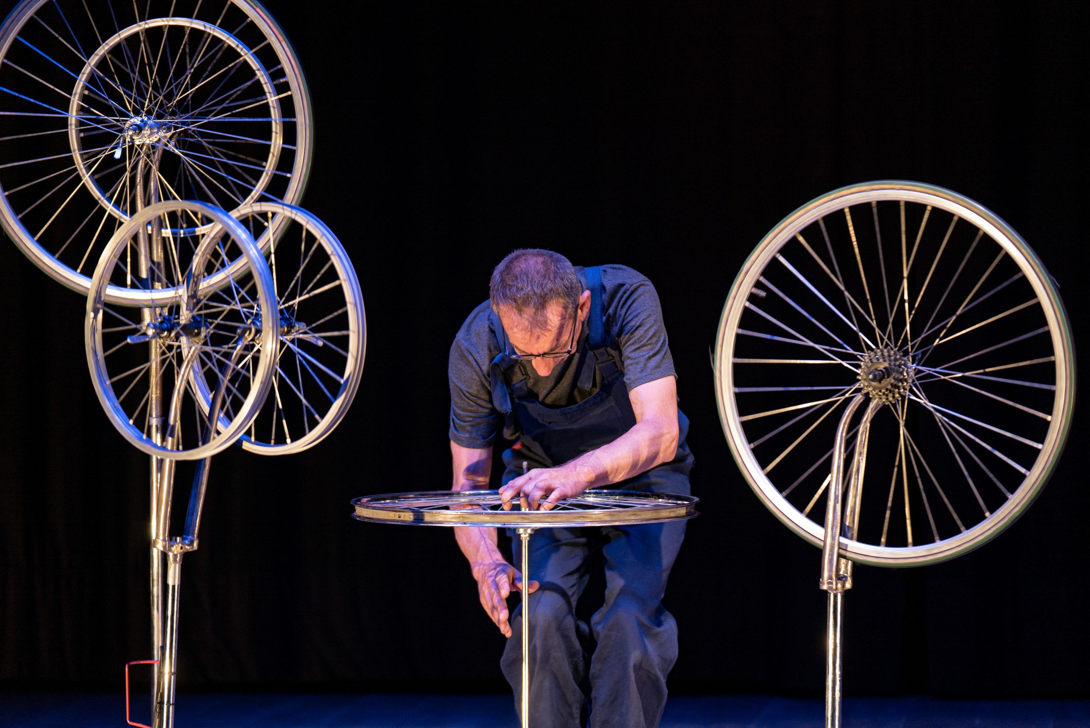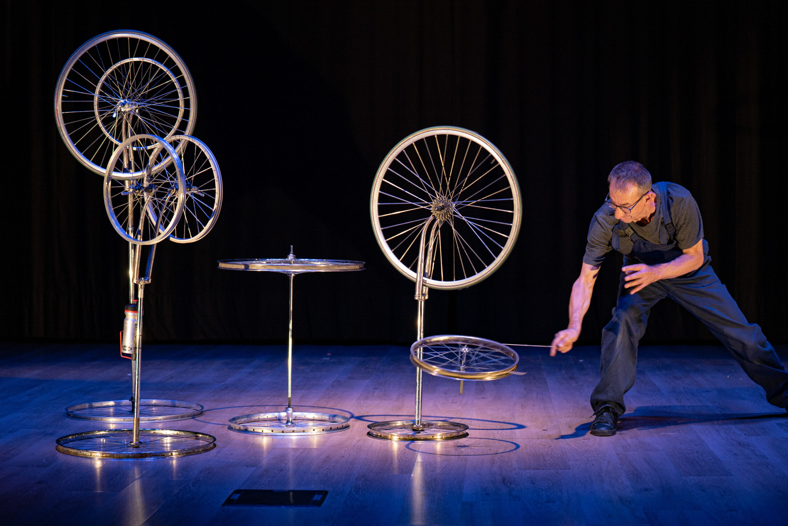 Mentre racconta, il protagonista costruisce davanti agli occhi del pubblico vere e proprie sculture mobili, architetture effimere fatte di equilibrio e pazienza, come la memoria. Manipola, incastra, solleva, fa girare, fa danzare: riparare è un atto di cura, di precisione.